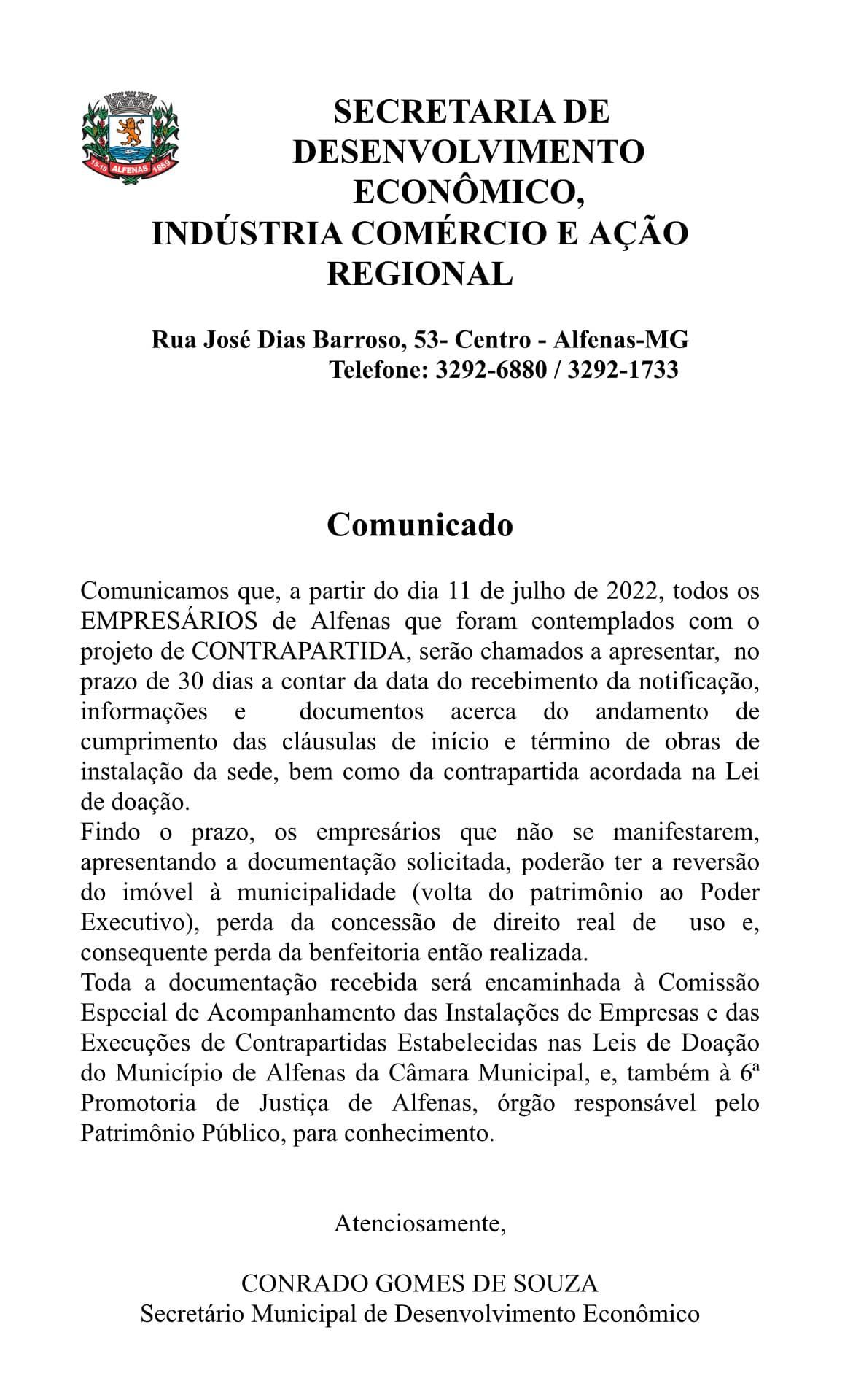 A Secretaria Municipal de Desenvolvimento Econômico está solicitando informações sobre as contrapartidas das empresas que receberam terrenos da Prefeitura de Alfenas. Um comunicado, no qual a comunidade alfenense é informada sobre a medida, foi divulgado essa semana.