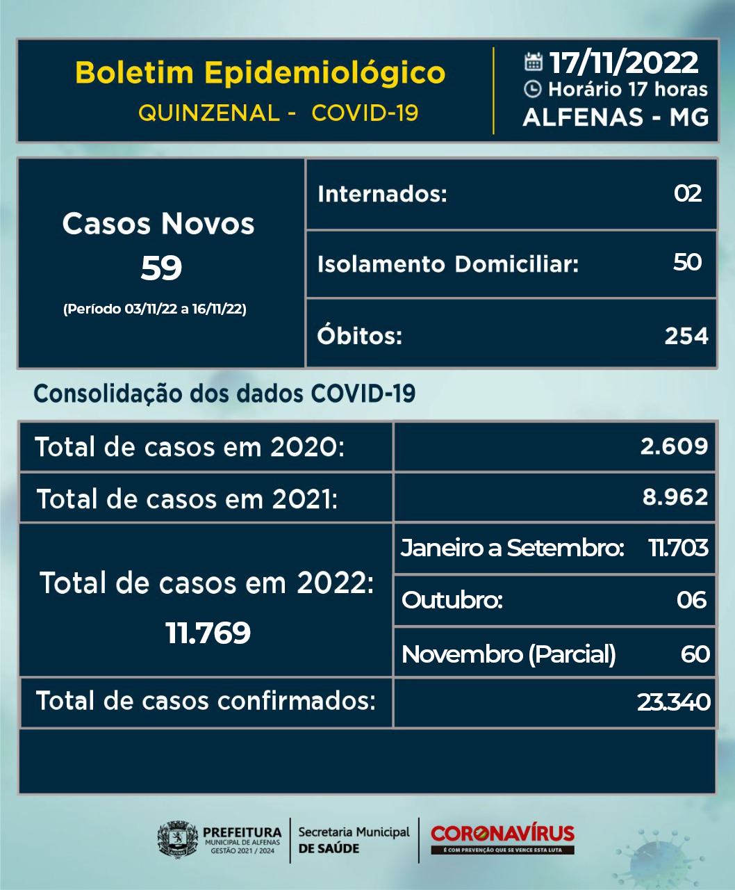 De acordo com o último boletim epidemiológico, desta quinta-feira, houve um aumento de 59 novos casos de covid-19 no período do 03 até 16 de novembro. Com isso, são 50 casos de pacientes em isolamento domiciliar, além de duas internações. Em outubro haviam sido seis casos.