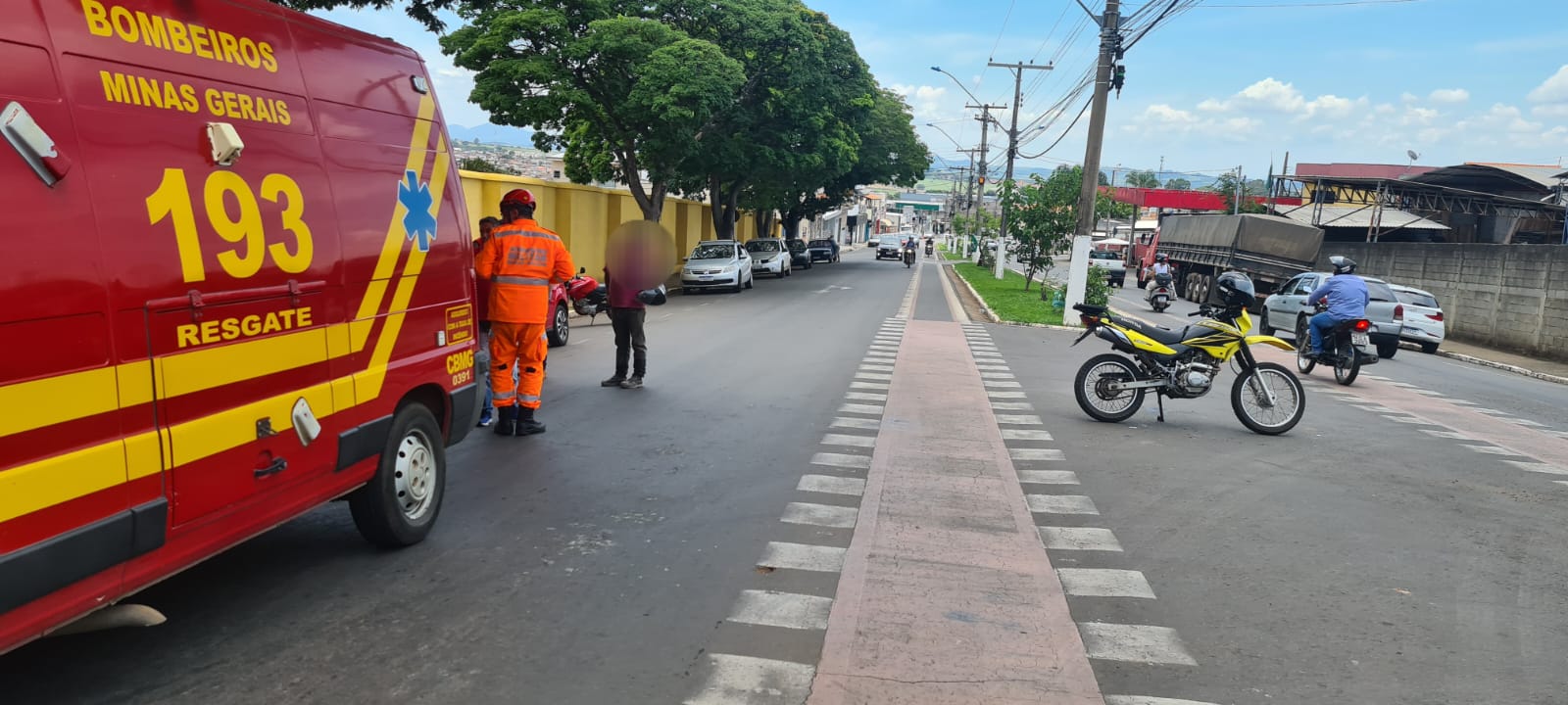 Uma equipe de resgate do Corpo de Bombeiros realizou o atendimento da vítima, imobilizando com tala moldável a região fraturada e continuando os demais procedimentos dentro da unidade de resgate até a chegada ao hospital. A condutora do carro não se feriu e permaneceu no local do acidente. Abaixo, foto divulgada pelo Corpo de Bombeiros.