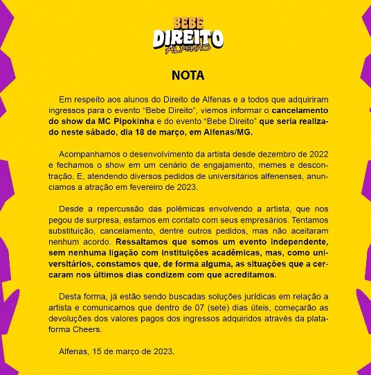 Mais um show da cantora MC Pipokinha foi cancelado e, dessa vez, em Alfenas. A apresentação estava marcada para o próximo sábado, dia 18, no evento “Bebe Direito Alfenas”.