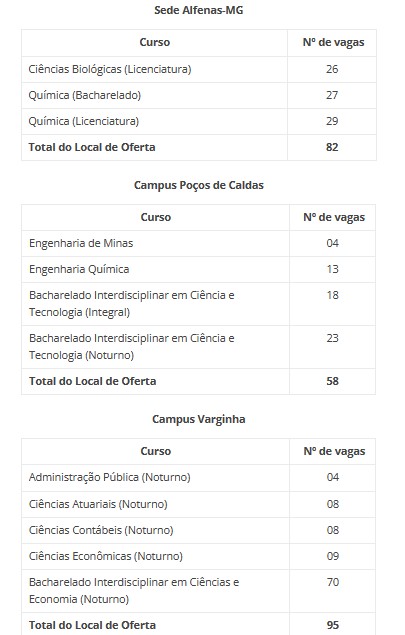 A Unifal (Universidade Federal de Alfenas) divulgou edital para o preenchimento de vagas remanescentes do processo seletivo do Sistema de Seleção Unificada (SISU 2023/2). São ofertadas 235 vagas para 12 cursos de graduação da universidade para os três campi: Alfenas, Poços de Caldas e Varginha.