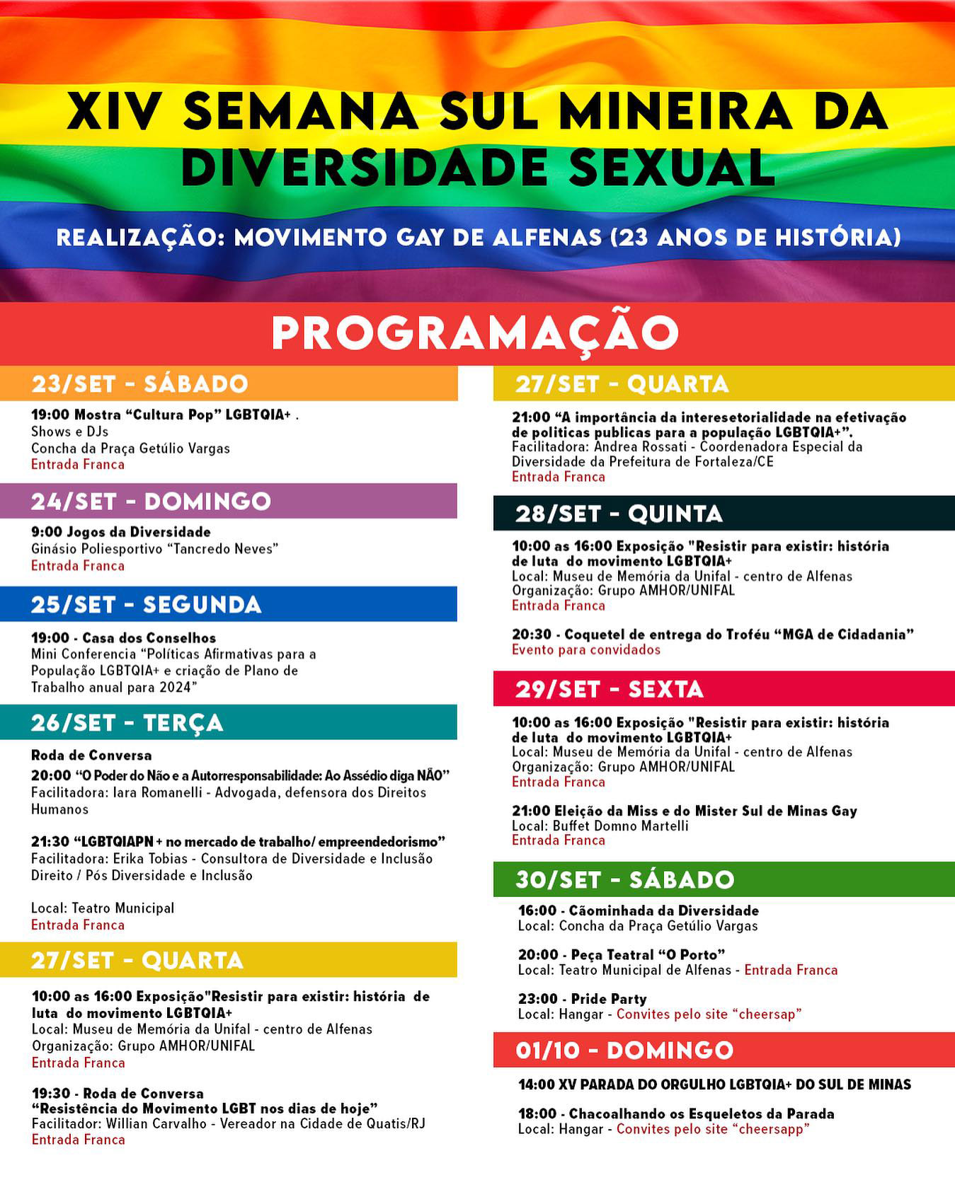 Toda a programação e organização da Semana Sul Mineira da Diversidade Sexual é do Movimento Gay de Alfenas e Região (MGA).