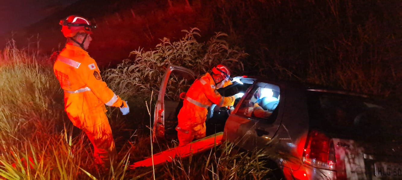 Motorista perde o controle, carro sai da pista e só para em ribanceira