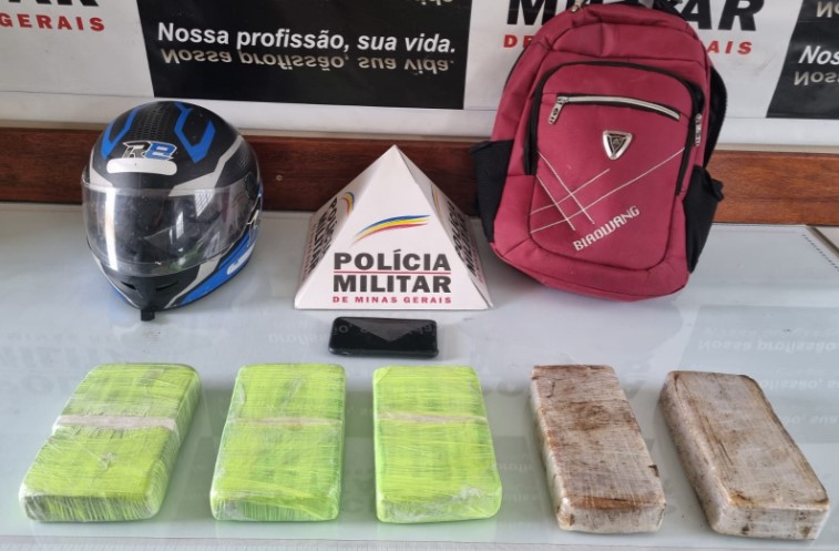 Durante a abordagem ao veículo, os policiais revistaram a mochila do suspeito e encontraram dois tabletes de substância semelhante ao crack, além de três tabletes de substância análoga à cocaína.