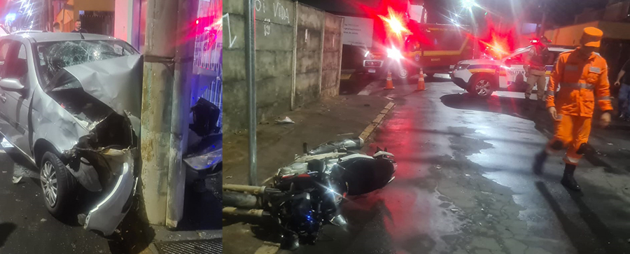 Uma grave colisão entre um carro e uma moto no cruzamento das ruas Presidente Artur Bernardes e Gabriel Moura Leite, no centro de Alfenas, resultou em três feridos na madrugada de segunda-feira. Após a batida com a moto, o carro perdeu o controle e colidiu violentamente contra um poste de iluminação pública.