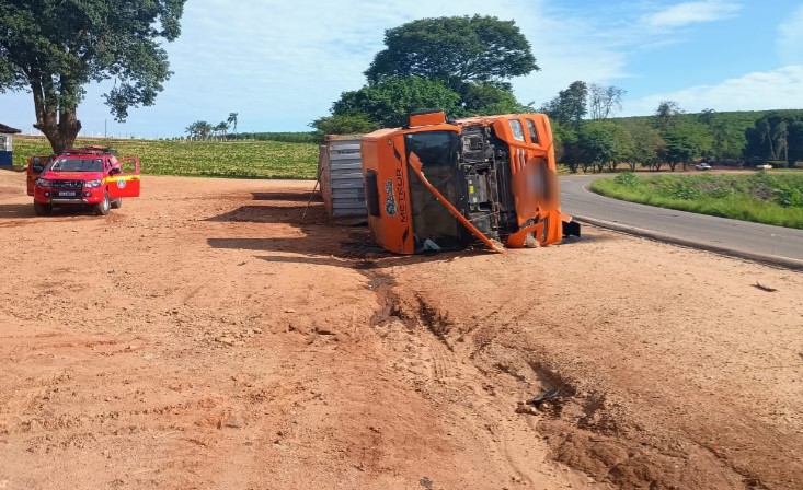Um caminhão, transportando dois contêineres de café, tombou na rodovia MG-179, km 10, próximo a uma curva. O acidente foi por volta das 6h da manhã e deixou o motorista, de 39 anos, ferido.