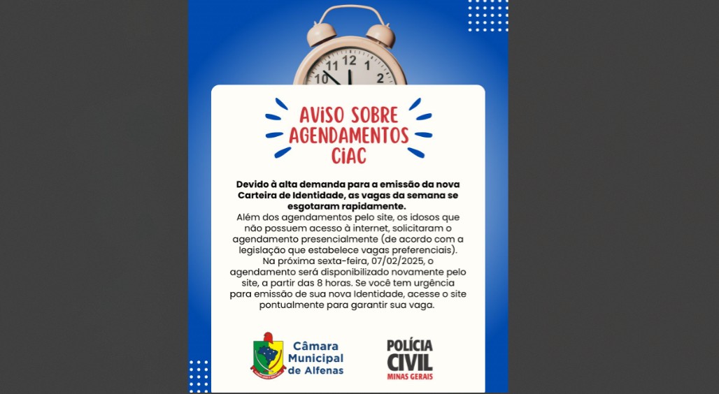 O CIAC passou a operar na Escola do Legislativo, em uma parceria entre a Câmara Municipal de Alfenas e a Polícia Civil, responsável pela emissão do documento. No último dia 17, em um café com a imprensa, o presidente da Câmara, Matheus Paccini (PDT), informou que há uma demanda represada e que a expectativa é que isso seja corrigido gradualmente.