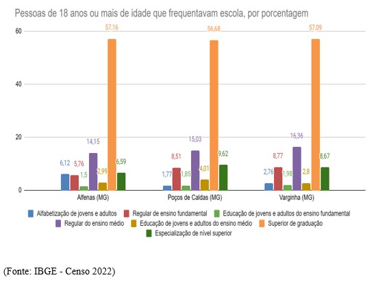 Outro dado que reforça o peso da educação em Alfenas é a frequência escolar acima dos 18 anos: 54,5% dos moradores dessa faixa etária ainda estudam. O cenário se repete entre pessoas com 25 anos ou mais, das quais mais de 18% seguem matriculadas em algum curso, índice acima da média nacional de 17%.
