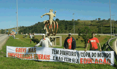 Ao lado da estátua do Pelé, o movimento unificado de greve exibiu faixas de protesto e cantou: "É piada de salão, tem dinheiro para Copa mas não tem para a educação". O protesto é devido da greve nas universidades públicas, que já dura 40 dias. A paralisação atinge professores e técnicos-administrativos.