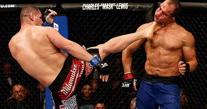 Cain Velasquez acerta chute alto em Júnior Cigano (Foto: Reprodução/blogplantaoaudiencia.wordpress.com)