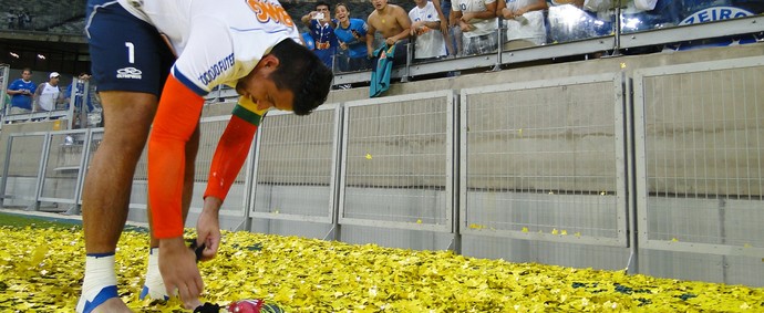 Uma volta olímpica não foi suficiente para o goleiro Fábio. A festa já estava no fim, o capitão já tinha erguido a taça, a volta olímpica havia dada há alguns minutos e, nas arquibancadas, restavam poucos torcedores. Mas foi aí que o camisa 1 do Cruzeiro começou uma nova festa. Sozinho, rodou o Mineirão comemorando com o torcedor e distribuindo lembranças. Foram-se as luvas, as chuteiras, meias, caneleiras, além do presente mais pedido: a camisa.