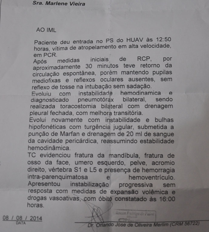 De acordo com o laudo do IML (Instituto Médico Legal), Marlene foi levada com vida para o Hospital Universitário Alzira Velano (HUAV), onde deu entrada às 12h50min. O documento aponta que o veículo que a atropelou estava em alta velocidade e revela o gravíssimo quadro em que a vítima chegou à instituição, com fraturas em diversos ossos da cabeça, rosto e corpo, principalmente do lado esquerdo, e hemorragias.