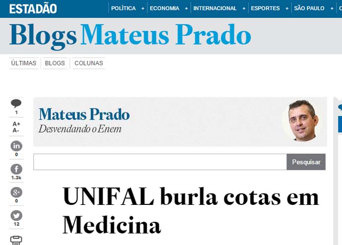 O artigo que provocou a mudança teve como título “Unifal burla cotas em Medicina” (clique aqui e leia na íntegra). Nele, Prado alegava que as regras para quem concorresse à Medicina este ano, por meio do Sisu, burlavam a “Lei das Cotas”.