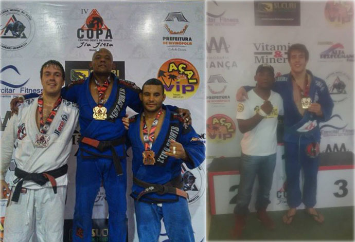 Camburão no pódio ao receber medalha de ouro no peso médio (faixa preta) ao lado de um de seus alunos, Flávio Frenhan que ficou em terceiro. Na foto ao lado, Camburão ao lado de Rubens Rios, que conquistou duas medalhas de ouro (Fotos: Facebook/Reprodução)