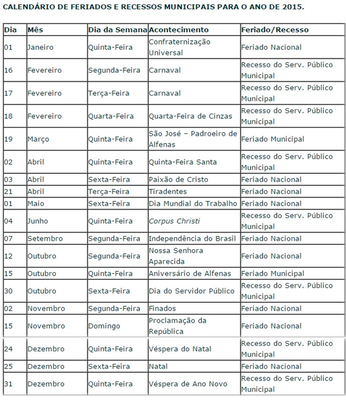 No início de fevereiro, a prefeitura havia divulgado o calendário de feriados e recesso para o decorrer de 2015. São 19 datas relacionadas na tabela abaixo.
